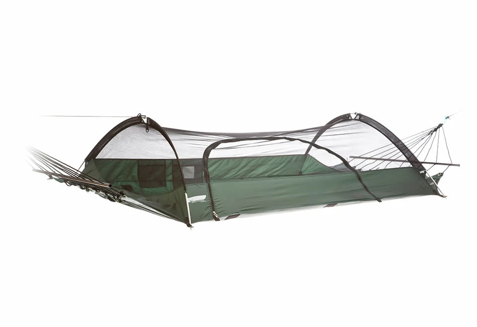• Unique arch pole/spreader bar system allows for use suspended between two objects/trees as a hammock or suspended tent, or on the ground as a ground tent